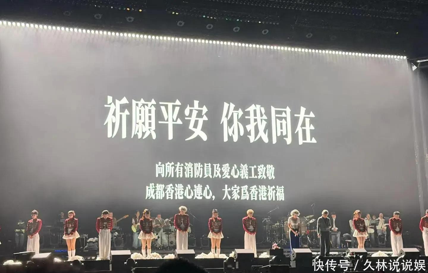 演唱会开始了,成都体育公园,2023年11月29号晚上,人很多,叶倩文和林子祥,大家都在欢呼,气氛很好,突然,叶倩文停下来,她要为香港火灾默哀,所有人都安静了,大屏幕变了,黑底白字,“祈愿平安,你我同在”,十秒钟,很安静,之后,有人喊“香港加油”,叶倩文哭了,她说了对大家的牵挂。